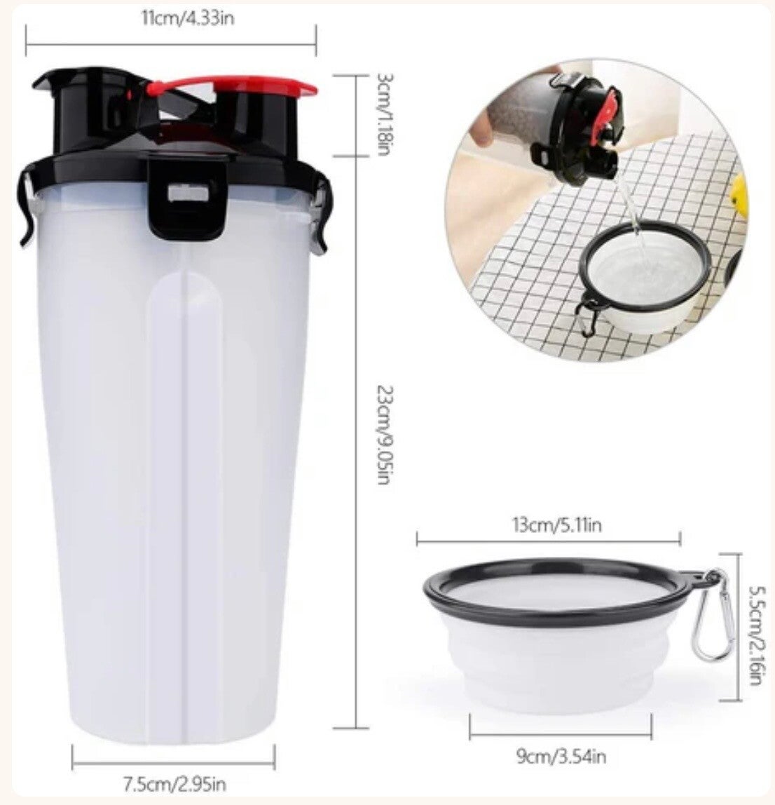 De fles heeft ruimte voor 350 ml water en de voedselcontainer kan tot 250 gram brokjes of snacks bewaren.