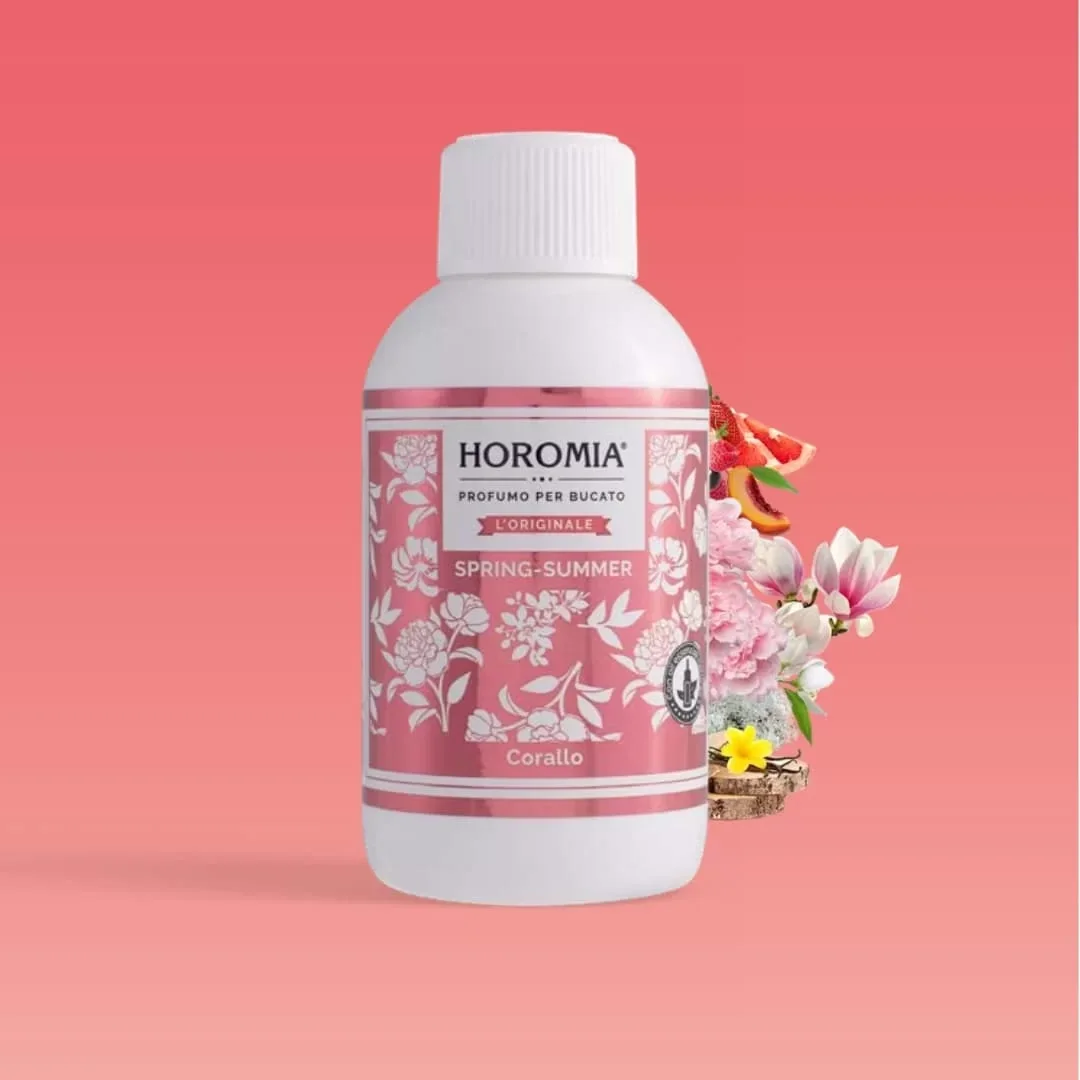 Horomia wasparfum Corallo voegt een geurexplosie toe aan al je wasgoed en is verkrijgbaar in 250ml formaat. Corallo is een heerlijke geurmix van grapefruit, rode vruchten, pioenroos, vanille en witte muskus.